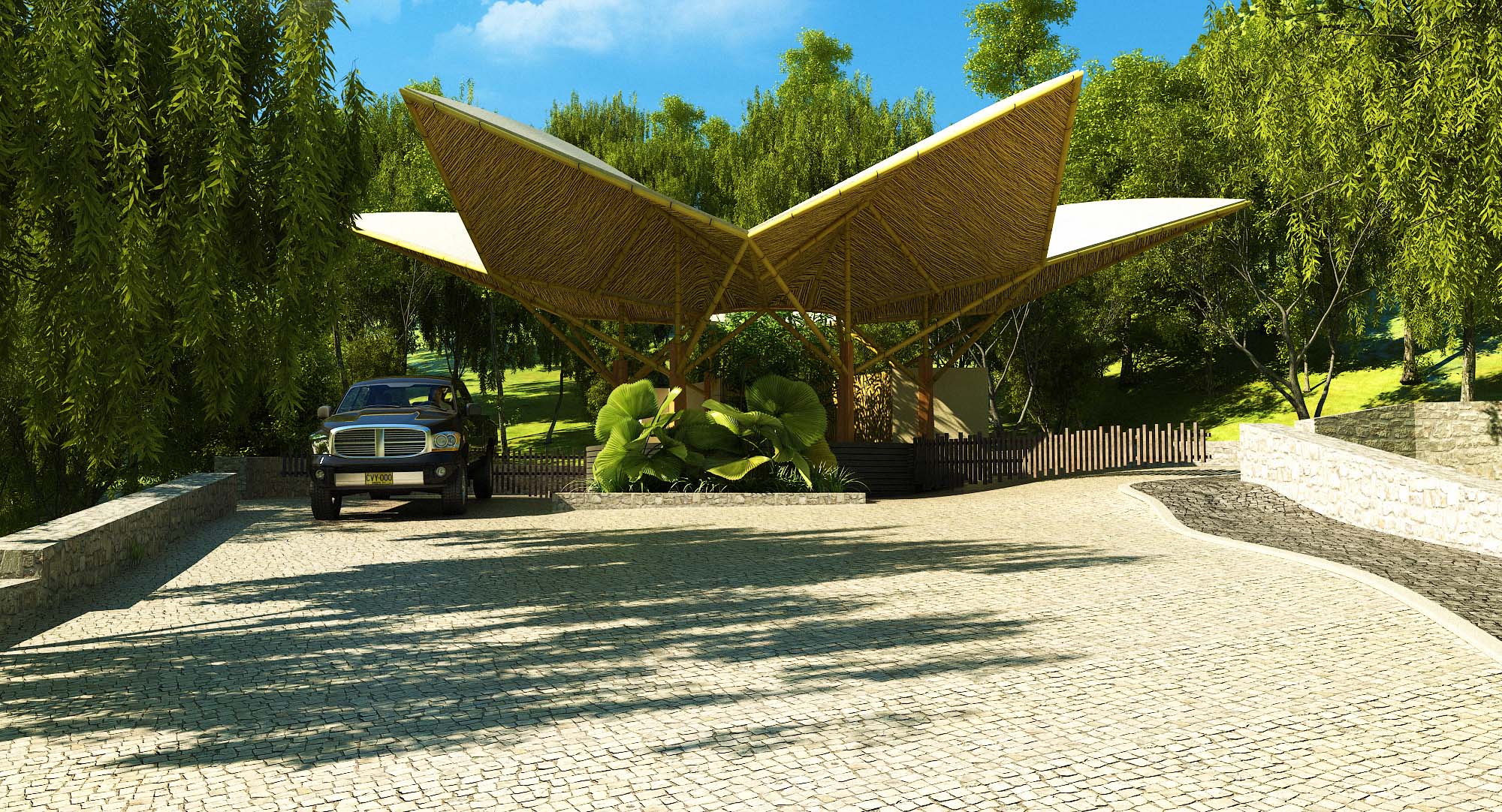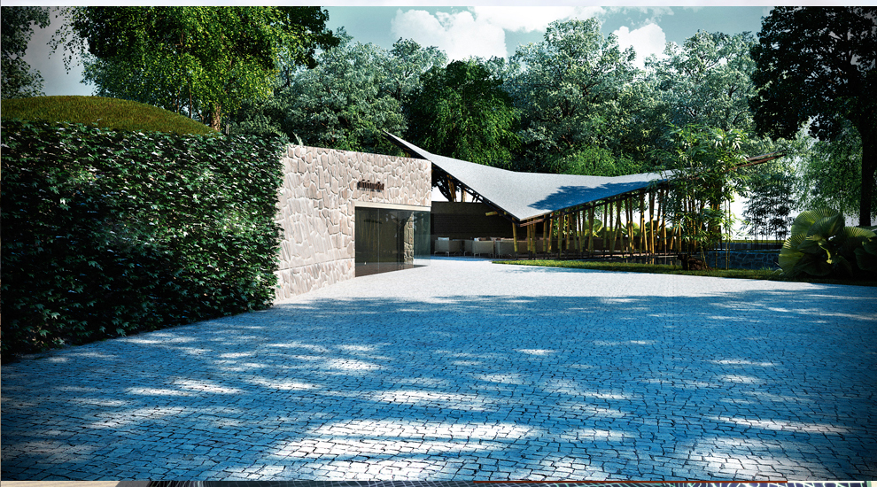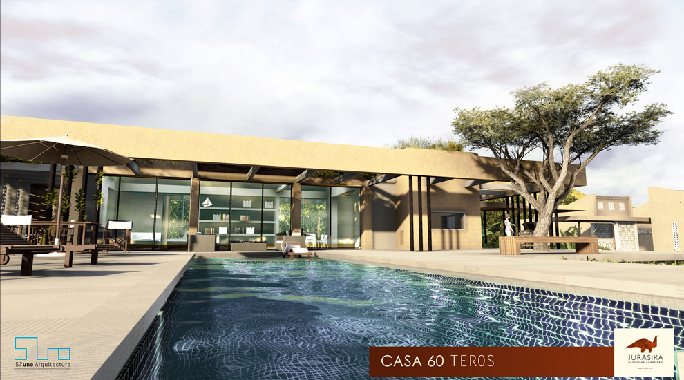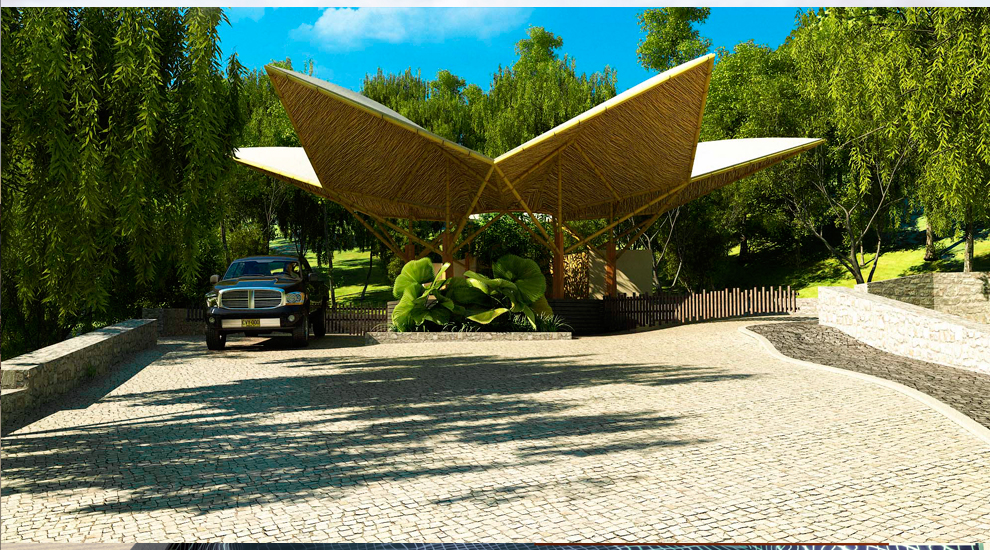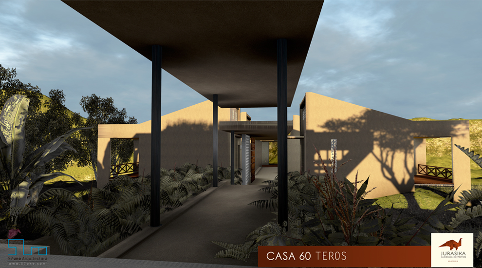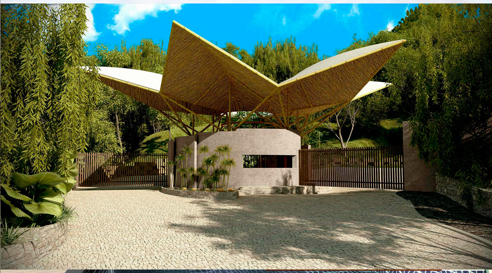 El proyecto JURASIKA, cuenta con una gran porteria diseñada y pensada para resaltar la naturaleza del lugar, su forma floral construida con materiales naturales y del lugar, refuerzan aun mas sus intensiones de invlucrarce con el paisaje. el diseño estratégico hace que el acceso al conjunto sea una experiencia única.